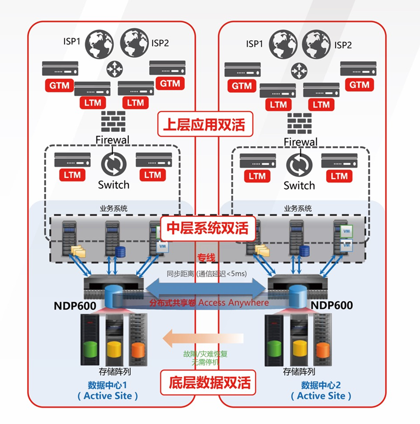 通過NDP600集中存儲的雙活架構(gòu),實現(xiàn)底層數(shù)據(jù)的兩端一致性
