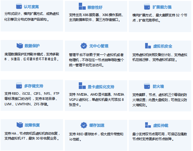 虛擬化場景融合計算和存儲資源,提供具有極簡 、高效 、可靠的虛擬化環(huán)境 。提供 OS 一鍵式交互安裝,支持業(yè)務(wù)的快速上線,靈活擴展 。對各類資源統(tǒng)一管理,按需分配,支持一鍵巡檢 、歷史性能數(shù)據(jù)統(tǒng)一監(jiān)控 。支持第三方虛擬化管理平臺 、CDP 保護平臺 。支持數(shù)據(jù)多副本及 EC 技術(shù) ,大幅提升用戶可得容量 。提供多種安全可靠策略 ,HA 高可用 、備份計劃,虛擬機保護,保障業(yè)務(wù)連續(xù) 。